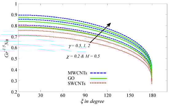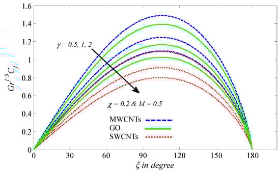 Carbon nanotubes and graphite oxide possess many distinct thermo-physical properties, making them widely used in numerous engineering and physical applications. High thermal conductivity and mechanical strength have earned them superiority over many nanoparticles in improving heat transfer. Two kinds of CNTs, specifically SWCNTs and MWCNTs, are considered in this article; one graphite tube forms the wall of SWCNTs, whereas MWCNTs are more complicated in structure Haq et al. [] studied the convection slip flow of CNTs about a stretching surface considering magnetic force. Aman et al. [] studied the free convective flow of carbon nanotubes Maxwell nanofluids. Iqbal et al. [] investigated the mixed convection CNTs nanofluids flow in a rotating vertical channel under the MHD effect, Hall currents, and radiation.