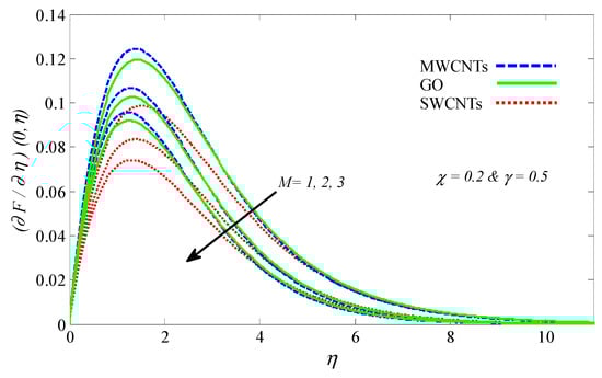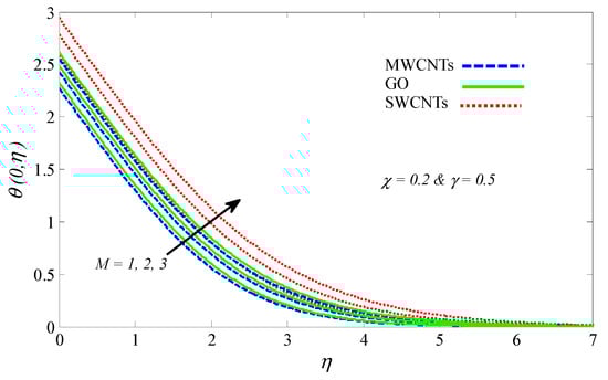 In Figure 10 and Figure 11, the influence of the magnetic field M on both temperature and velocity are elaborated. It is noted here that Lorentz force formed by the growth of the magnetic field decelerates velocity and enhances the temperature. In fact, a magnetic field yields a drag-like force; namely, the Lorentz force. This force acts in the opposite direction, which results in the reduction in velocity, and the fluid temperature boosts by magnifying the strength of the magnetic field.