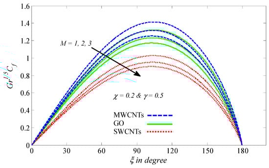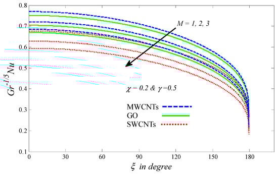 In Figure 12 and Figure 13, both the skin friction coefficient and local Nusselt number declined with increasing values of the magnetic parameter M. This is attributable to the fact that as the intensity of the magnetic field rises, the motion of the fluid is inhibited as a result of the generation of Lorentz force. This leads to the argument that an applied magnetic field tends to heat the nanoliquid, and thus heat transfer from the cylinder reduces, and then both local skin friction coefficient and local Nusselt number reduce. All of this happens due to Lorentz force in the visualization of the transverse applied magnetic field opposing the transport phenomena and slowing down the fluid movement. No doubt, the magnetic can be utilized as a beneficial agent for controlling the flow and heat transfer characteristics. Moreover, the graphical findings revealed that MWCNTs - methanol generated the highest heat transfer rate, skin friction, and velocity, as well as it had the lowest temperature, this is due to the unmatched thermal properties that possess MWCNTs.