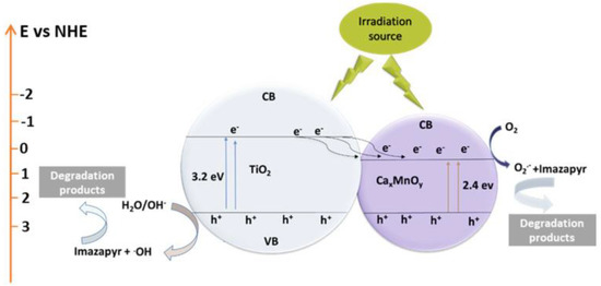 - Bougarrani, S.; Sharma, P.K.; Hamilton, J.W.; Singh, A.; Canle, M.; El Azzouzi, M.; Byrne, J.A. Enhanced Photocatalytic Degradation of the Imidazolinone Herbicide Imazapyr upon UV/Vis Irradiation in the Presence of CaxMnOy-TiO2 Hetero-Nanostructures: Degradation Pathways and Reaction Intermediates. Nanomaterials (Basel) 2020, 10, 896. [Google Scholar] [CrossRef] [PubMed]