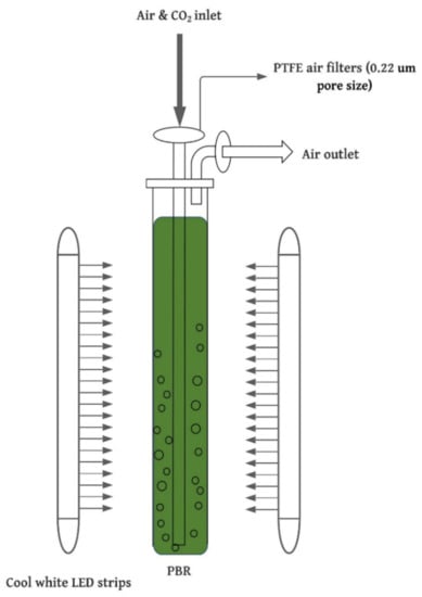 Schematic diagram of the 150 mL lab-scale photobioreactor (PBR), used for Scenedesmus sp. cultivation. The air and CO2 inlet and air outlet were equipped with 0.22 µm PTFE (Polytetrafluoroethylene) filters (Sigma-Aldrich, Saint Louis, MO, USA).