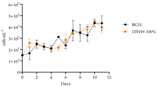 Cell density of the batch culture of Scenedesmus sp. in BG11 standard medium and dairy industry wastewater (n = 3).