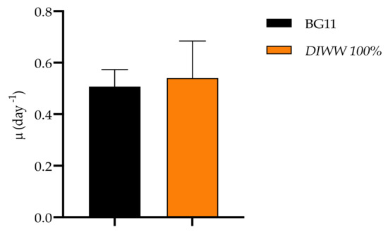 Specific growth rate of Scenedesmus sp. obtained in standard BG11 culture medium compared to the medium with the dairy industry wastewater (n = 3).