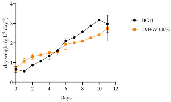 Biomass productivity obtained with Scenedesmus sp. in BG11 culture medium and wastewater from the dairy industry (n = 3).