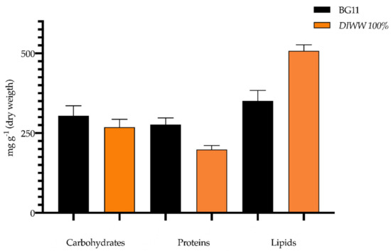 Biomass composition of Scenedesmus sp. grown in standard BG11 culture medium and dairy industry wastewater (n = 3).