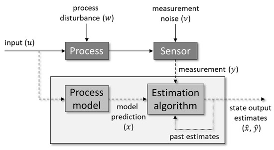 State estimation refers to a set of mathematical techniques designed to reconstruct the state information of a system. In particular, unmeasured state variables are estimated based on available model output predictions and noisy measurements. The main challenge in the state estimation task is to provide reliable online estimation under process and measurement uncertainties while being computationally tractable. Process uncertainties usually come from plant-model mismatch and disturbances, whereas measurement noises are mainly related to the instrument’s precision. Figure 1 presents a schematic diagram of state estimation that consists of two main stages: model prediction (i.e., a priori state estimate) and measurement update (i.e., a posteriori estimate, based on current and past measured variables). Past estimates may also be used in recursive estimation algorithms.