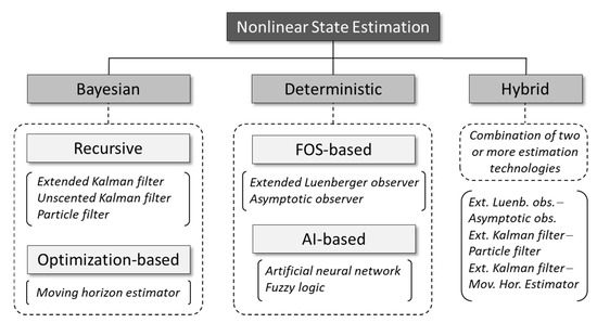 General classification of the main nonlinear state estimators used for chemical and biochemical systems. Representative estimators are depicted in the brackets under each subgroup.