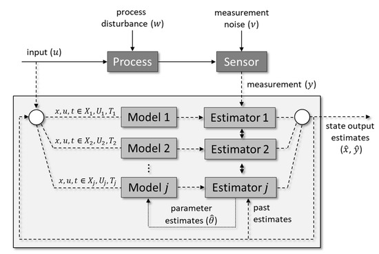 Finally, there are systems whose dynamics may not be fully described by single models throughout the process or operating conditions, as represented by Equation (8). In these cases, multiple (simple) models can be used, either in an on-off switching policy or combining them using fuzzy logic, for example, to guarantee a smooth transition between process models [52], as outlined in Figure 4. Then, state estimators may be implemented based on multiple process models, switching the models abruptly or smoothly according to specific ranges of system states, input variables, and/or process time. The commutation (on-off switching) between three specific growth models, valid under different ranges of substrate concentrations, was applied in reference [107]. The authors used the MHE to estimate the cell and substrate concentrations, as well as the specific growth rate, for a generic cultivation process. In [108], on the other hand, trust factors , ranging from 0 to 1, were implemented to value gradually the contribution of output predictions from three process models to the MHE objective function. These trust factors, in turn, depend on the past and current model accuracy (i.e., distance between measured and predicted outputs) at a time instant , during a bioprocess operation to produce poly--hydroxybutyrate (PHB).