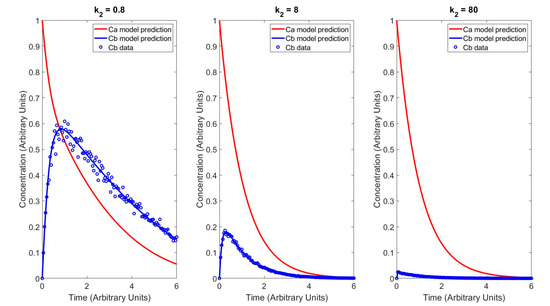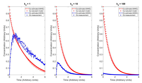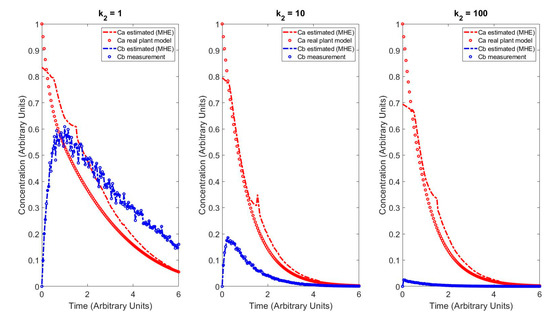 in which k1, k−1, and k2 are the reaction kinetic parameters and Ca, Cb, and Cc are the concentrations and state variables. For all case studies performed, k1 and k−1 are fixed to a value of 1 with appropriate units, while k2 can change to either a value of 0.8, 8, or 80 with appropriate units. These k2 values are assumed to be the real k2 values and are used to generate the simulated data/measurements associated with the plant model. As component C does not influence the estimation implementations below, its concentration has not been included in the state-space model shown in Equation (15).