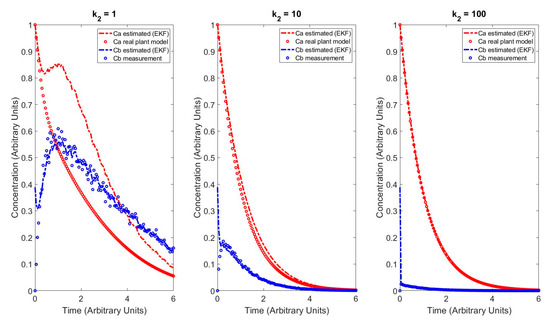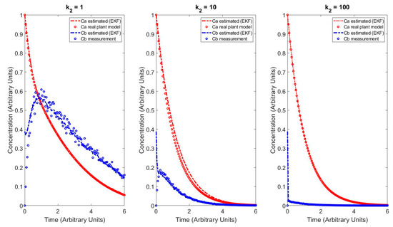 Using the simulated measurements and ideal k2 values, an EKF is applied to the reactor system employing a testing value of 0.001 for the diagonal elements of the process noise matrix (Q) of size 2 × 2 and a testing value of 0.0035 for the measurement noise matrix (R) of size 1 × 1. These values were chosen as most of the noise in the system is derived from the measurements, hence R is greater than Q. Additionally, approximations of the noise were used, as it mirrors how estimation is often conducted in industrial processes. It is also assumed that an accurate initial estimate of the concentration of state B is unavailable, providing an additional challenge to the implemented state estimator. Thus, the initial concentrations of component A and component B are assumed to be 1 and 0.5 concentration units, respectively. Additionally, the initial value of the covariance matrix (P-(0)) for the EKF is specified as a diagonal 2 × 2 matrix with diagonal elements of values of 0.001. Equations (15) and (16) display the symbolic linearized statespace model for this system. Figure 6 shows the EKF implementation results, considering each ideal k2 value.