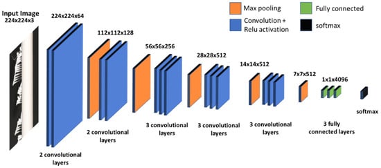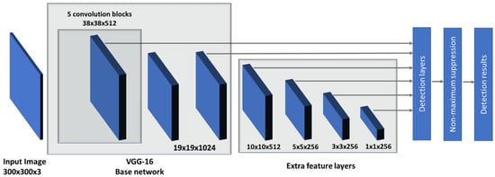 The Single Shot Detector consists of two phases: In the first, there is a feed-forward convolutional network (used as typical image classifier) that has a fixed size collection of bounding boxes as output. The used convolutional network is VGG16 [], which is based on standard convolutional neural network (CNN) architectures: Multiple convolution layers and ReLU activations followed by max pooling functions are producing the input to fully connected layer (Figure 2). A final softmax function produces probabilities of the image to belong to a class. In total, there are 16 convolutional layers and 3 fully connected. VGG16 achieved 92.7% test accuracy in ImageNet, which is a dataset of over 14 million images belonging to 1000 classes. It was chosen in our case as the CNN network, due to its reliability in image classification tasks as well as due to its use in the original SSD-300 publication []. In the SSD architecture, the described VGG16 is called the base network.