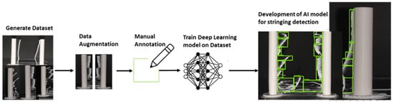 In this stage, a score is given to each box referring to the probability of presence of an object class. Then, extra convolutional layers are added at the end of the base network, whose size decreases progressively until reaching a non-maximum suppression []. These extra layers can help detect at multiple scales. The non-maximum suppression decides the final detections with use of the extra convolutional feature layers at the end first network. The selected model was trained with use of the Tensorflow application programming interface (API) [] and on a NVIDIA Tesla K80 GPU with 2496 cores of Compute Unified Device Architecture (CUDA) and 12GB of Graphics Double Data Rate (GDDR5) Video Random Access Memory (VRAM). Our selected hyperparameters for the trained model architecture of Figure 3 are presented in Table 2. The methodology for the development of the Deep Neural Network for detecting stringing defects is presented in Figure 4.