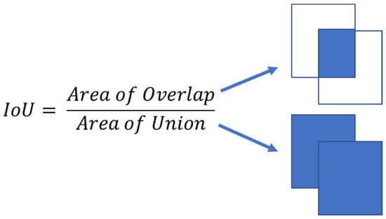 In order to evaluate the detection results of the developed neural network, a proper metric is defined. As object detection algorithms use bounding boxes to make local prediction, the Intersection over Union (IoU) helps to quantify the precision of a specific predicted bounding box (Figure 5). IoU measures the overlap between two bounding boxes. Specifically, IoU quantifies the amount of overlap of the predicted bounding box and the ground truth bounding box. In our case, we experimented with a threshold of 0.4, 0.5 and 0.6 as the margin for true or false predictions. In the case of an IoU equal to 0.5, if the IoU value of a specific bounding box is greater than 0.5, we consider this a true positive prediction. This can be further used to calculate the True Positives, False Positives or False Negatives of the models given a test set. In our case, we do not evaluate True Negatives, as each image in the test set has at least one defect.