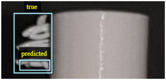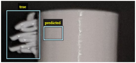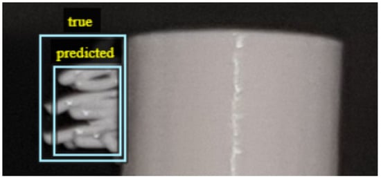When the IoU is greater than 0.5 (threshold), the respective prediction is a True Positive (TP), meaning that the predicted defect was real. In cases where the IoU is less than 0.5, we have a False Positive (FP), meaning that the predicted defect was not real. Finally, when the model completely misses a true defect, we consider this a False Negative (FN). The above cases are presented in Figure 6, Figure 7, Figure 8 and Figure 9.