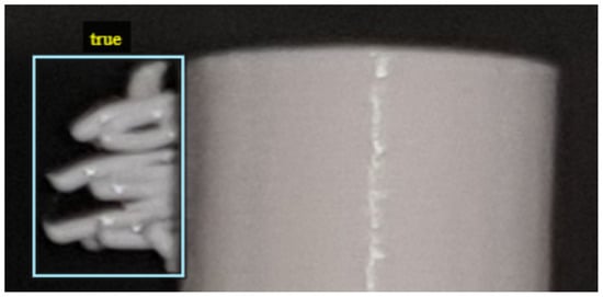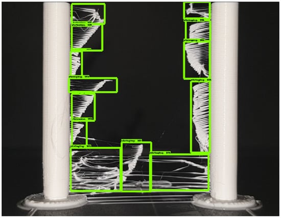 The F1-Score for the IoU threshold of 0.4 is 0.55. There are some aspects around this number that are promising signs for future improvements: the original 500 images are considered not enough, as we need to predict shapes (stringing) of various geometries. Accuracy metrics are therefore expected to increase if we significantly increase the training data. Creation of new data should be also focused on rarely seen (in current training) cases. Regarding Average Precision, the trained SSD model reached 0.4 at an IoU threshold of 0.6, 0.44 at an IoU threshold of 0.5 and 0.52 at an IoU threshold of 0.4. Research on benchmark datasets [,] has shown that Average Precision is a good metric for identifying bad or insufficient training data for a specific class. This approach can be useful and efficient, when the goal is to detect known stringing defects. In other words, the expected input images in a real environment will be similar to the training data. Our trained model was able to achieve a Precision of 0.75 and a Recall of 0.92 when seeing the training data (training F1-Score 0.82). This result shows that the use of recently developed Neural Networks can help automate detections of defects with expected shape or low variety. The trained model was considered to perform well in this work and therefore can be used as an automated way of detecting stringing and sending respective notifications. This study is serving as a proof of concept that Deep Learning can be used for the detection of standard and expected stringing defects and specifically when the input video feed in the deployed model is expected to be similar to the training data that the model has seen. Such a prediction on a video frame is illustrated in Figure 12.