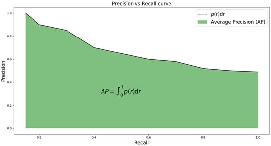 Each prediction (whether it is TP or FP) comes with a probability score (probability that a bounding box contains a defect). Ordering all of the predictions with descending order according to the confidence level (0 to 1.0), one can compute how Precision and Recall are changing with respect to the confidence level by plotting their values in a Precision vs. Recall plot (Figure 10). Our final metrics will be the Precision and Recall. In addition, the Average Precision, which is defined as the area under the Precision–Recall curve can also help identify the pros and cons of selecting each probability threshold with respect to the discrimination ability of the classifier. Average Precision can be interpreted mathematically as the weighted mean of precisions achieved at each probability score, with the increase in recall from the previous threshold used as the weight. Average Precision is used as a metric in the development of state-of-the-art models as well as in benchmark dataset challenges [].