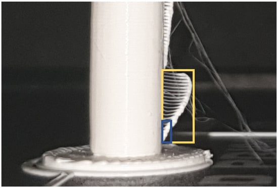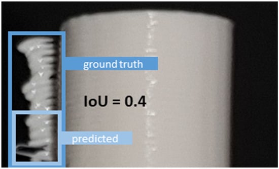 The trained model achieved a Precision of 0.44 and a Recall of 0.69 at an IoU of 0.4, a Precision of 0.41 and a Recall of 0.63 at an IoU of 0.5, and a Precision of 0.4 and a Recall of 0.62 at an IoU of 0.6. Increasing the IoU threshold, predictions are forced to be more strict, resulting in less accurate metrics. We found that the threshold of 0.4 IoU is often selected in similar custom object detection tasks [,,,], whereas the most used value is 0.5. However, it might result in having more False Positives (lower precision), as the threshold of approving the classifier’s guess becomes higher. An IoU threshold of 0.4 is acceptable in our case, as we need just a little intersection over union between ground truth and prediction: a predicted defect overlapping at least 40% with any given true defect should be considered as a true positive and be handled as a defect (Figure 11). With the current training data, if we wish to increase the number of true defects that are detected (True Positives), we need to keep the IoU threshold to this minimum. Below 0.4, values of IoU threshold result in significant high false detection (False Positives). Therefore, increasing the IoU threshold will give less True Positives but also less False Positives. Choosing a value for the IoU threshold is an issue of balancing between these two. In our case, we selected to be alarmed (defect detection) even falsely rather than not being alarmed at all. A high Precision is needed when the cost of False Positives (normalities detected as defects) is high. On the other, a high Recall is preferred when the cost of False Negatives (real defects not being detected at all) is high. In our case, the cost of missing defects is higher compared to the cost of predicting stringing defects to a normal print. Specifically, we prefer to be alarmed falsely (False Positive–Low precision) than miss defects (False Negative–Low recall). Therefore, we chose the trained model with an IoU threshold of 0.4 (Precision of 0.44 and a Recall of 0.69) for live deployment.