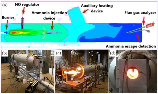 Nitrogen oxides (NOx, x = 1,2), as major air pollutants, are resulting in a series of environmental issues, such as photochemical smog, acid rain, ozone depletion, and fine particle pollution. Many efforts have been made to reduce NOx emission by using advanced combustion technologies or by using post-combustion abatement technologies [,]. Among various kinds of NOx removal technologies, a simple process for reducing NOx to nitrogen and water is an ideal way. Two major post-combustion NOx control techniques are selective catalytic reduction and selective non-catalytic reduction, which are widely used in large combustion units, such as various boilers, refineries, and waste incinerators [,,]. There have been many investigations on the effect of parameters on the performance of NOx catalytic reduction in the laboratory, but several investigations have been reported about NOx reduction by advanced reburning, the effects of temperature, NH3/NOx molar ratio (NSR), and other factors on NOx reduction have been studied, under the optimized conditions, the efficiency NOx reduction of advanced reburning could potentially increase to more than 85% [,,,,]. However, these investigations are mainly focused on cement precalciner kilns and utility boilers; the application of advanced reburning in oxidized pellet production has not been reported yet. Besides, many experiments were performed in various laboratory-scale reactor, all of them which temperature was controlled by an electric heating furnace, designed to maintain the reaction temperature at the desired value, and the NOx reduction reaction process in a gas-fired environment does not simulate well. Thus, the advanced reburning of in grate-rotary kiln needs further study.