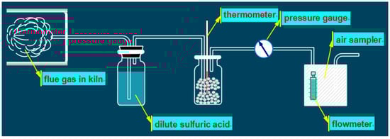 The determination of ammonia concentration in flue gas was referred to as the National Environmental Protection Standard of China “Determination of Ammonia in Ambient Air and Exhaust Gas by Nessler Reagent Spectrophotometer” (HJ 533-2009). The schematic diagram of the determination for ammonia slip, as shown in Figure 2. The principle as follows: The ammonia in flue gas was absorbed by dilute sulfuric acid firstly, and then the generated ammonium ion reacts with Nessler’s reagent to a form yellow-brown complex. The absorbance of the sampling absorption solution was measured at a wavelength of 420 nm. Since the absorbance of the above complex was proportional to the content of ammonia in solution, the ammonia content in the gas can be calculated based on the absorbance.
