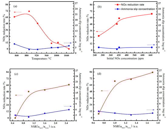Figure 3a showed the effects of temperature on the NOx reduction and ammonia slip when the NSR was around 1.1, and the initial concentration of NOx was about 390 ppm. It can be seen that excessive temperature was not conducive to reducing NOx, the NOx reduction rate slightly increased first and then decreased sharply with the rise of temperature, and the NOx reduction rate reached the highest of 71.3% at 890 °C.