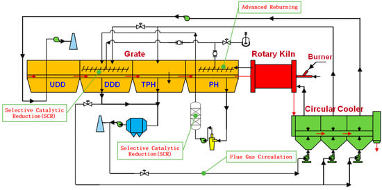 The grate-rotary kiln process consists of three parts: The grate, the rotary kiln, and the cooler []. Green pellets are dried and preheated through the four zones of the grate (i.e., updraft drying zone, downdraft drying zone, tempered preheating zone, and preheating zone), preheated pellets are then fed into the rotary kiln for roasting at a high temperature to obtain better metallurgy performance, and in the rotary kiln, most often coke oven gas is used as fuel to meet the requirement of high temperatures. The flame temperature of the burner in the rotary kiln can even reach 1600–1850 °C with the combustion of gas, a large amount of thermal NOx generates for the temperature well above 1300 °C, and it dominates NOx formation, accounting for more than 80%. The generated NOx is firstly circulated with the hot flue gas to the preheating zone, and then to the downdraft drying zone. The terminal NOx emission usually exceeds 200 mg/m3.