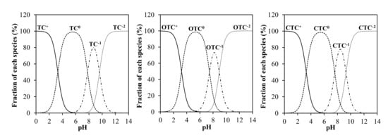 The molecules of these antibiotics from the group of tetracyclines are amphoteric, with three different acid dissociation constants (pKa), which allows that they can exist as cation, zwitterion and/or anion, depending on the pH of the medium. Specifically, the molecule of tetracycline (TC) has three different acidic functional groups, which are tricarbonyl methane (pKa ~ 3.3), phenolic diketone (pKa ~ 7.8), and the dimethylammonium cation (pKa ~ 9.6). Furthermore, the three antibiotics of the group considered in this work present similar pKa values, which suggests that TC, OTC, and CTC have a similar pH-dependent speciation (Figure 1). Finally, it should be noted that TCs form complexes with chelating agents such as multivalent metal ions (like Mg2+, Ca2+, Fe2+, Zn2+, Al3+ and Fe3+) and ß-diketones [12,13].