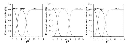 Percentage of each species of sulfadiazine (SDZ), sulfamethazine (SMT), and sulfachlorpyridazine (SCP) as a function of pH.