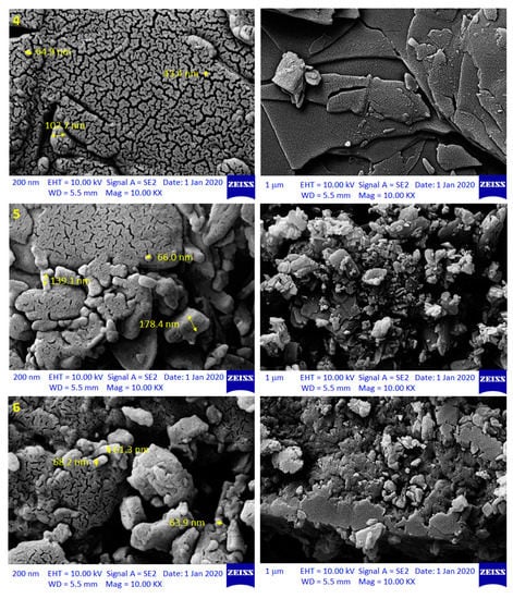 In particular, the FESEM images shown in Figure 1 indicated that 4–6 were porous materials and irregular in shape, uniform, and contained cracks within smoother surfaces. However, despite their similar surface morphology, the particles within the surface had different shape, size, and diameter. Specifically, the particle diameter of polymers 4, 5, and 6 was 35.3–109.8, 40.2–178.4, and 45.2–208.2 nm, respectively.