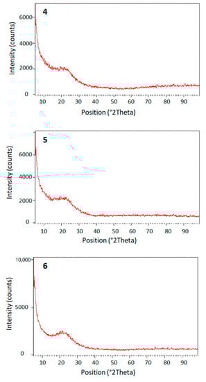 The X-ray powder diffraction was also used to examine the surface of the synthesized polymers 4–6, as it can provide useful information about the crystallinity, defects, average grain size, and strain of the examined material []. As shown in Figure 2, polymers 4–6 had amorphous and very similar structures, which contained an aura that was described as a broad hump. There was no degree of any crystalline form within the polymeric structure. The amorphous structure could result from the sliding of the layers, which destructed the crystalline forms. It should also be noted that there were no peaks indicating a specific recurring shape within the structures.