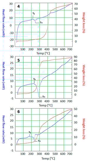 Figure 3 shows a significant weight loss was observed between 285 °C and 400 °C (Table 4), suggesting that the polymers 4–6 consisted of only one phase due to the lack of secondary products. DSC is also used to measure various thermal parameters of materials []. The glass transition (Tg) and melting (Tm) temperatures for polymers 4–6 were determined from the DSC measurements (Table 4, Figure 3). According to these results, we concluded that polymers 4–6 are amorphous and thermally stable materials at a temperature up to 290 °C and have endothermic peaks.