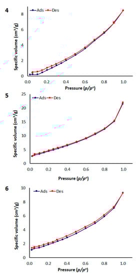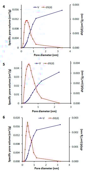 The BET method is generally used to estimate the surface area of the examined adsorbents [,]. The collected data are displayed in the form of a N2 adsorption isotherm, which is obtained by plotting the quantity of the adsorbed gas against the relative pressure. The N2 adsorption–desorption measurements of polymers 4–6 at 77 K were of type III with no single-layer adsorption and their average pore diameter and total volume were less than 2 nm (i.e., microporous materials) and 0.015–0.034 cm3 g−1, respectively (Table 5). The N2 adsorption–desorption and pore size distribution isotherms of polymers 4–6 are shown in Figure 4 and Figure 5. The BET surface area (SBET) of polymers 4, 5, and 6 was relatively low (Table 5). Clearly, both the surface area and pore volume of polymers 4–6 are lower compared with those for activated carbons [].