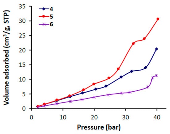 The CO2 adsorption of polymers 4–6 was investigated at 323 K and 40 bar. High temperature and pressure were used in order to maximize the CO2 uptake by polymers based on our previous work [,,,]. The CO2 adsorption isotherms for the adsorbed CO2 within the polymer pores under the applied temperature (323 K) and pressure (40 bar) conditions are shown in Figure 6. Polymers 4–6 showed a reasonable CO2 uptake in the range of 11.295–30.581 cm3 g−1 (Table 6), while polymer 5 with the meta-arrangement exhibited the highest CO2 uptake (6.0 wt%), probably due to its relatively high surface area (18.012 m2 g−1) and total pore volume (0.034 cm3 g−1) compared to the other two polymers with ortho- and para-arrangements. Similar findings have been reported for polyphosphates containing 1,4-diaminobenzene and benzidine [,]. It was thus clearly indicated that the pore size distribution and surface area can affect the CO2 storage capacity of polymers 4–6 under the applied conditions. Since these parameters are probably mainly controlled by the geometry of the polymer building blocks, the higher CO2 adsorption capacity of 5 could also be explained.