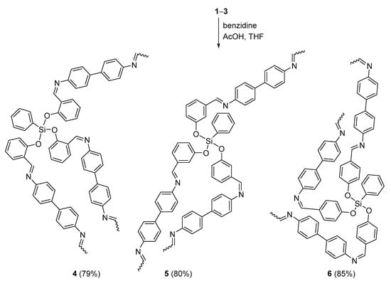 The reaction of 2-, 3-, and 4-hydroxybenzaldehyde with phenyltrichlorosilane in pyridine as a base at 40–45 °C for 6 h afforded the desired [(phenylsilanetriyl)tris(oxy)]tribenzaldehydes 1–3 as yellow oils in 73–85% yields (Scheme 1).