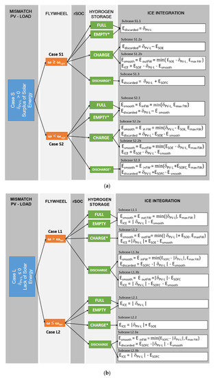 - Subcase S1.3 occurs in days of lack of surplus: when is positive, the bulk storage is not charged, and the rSOC just runs as fuel cell. Hence, the energy produced by the rSOC (ESOFC), minus the flywheel losses, is discarded. The flywheel is idle.