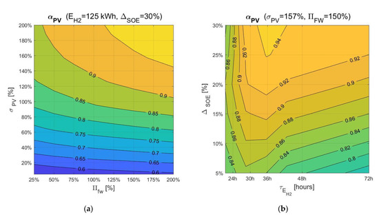 - This circumstance may arise: (i) during days with a positive cumulated surplus of energy (=), in conjunction with an instantaneous negative value of , when either the hydrogen tank is already full (EH2=EH2,max), or the rSOC cannot be operated as a fuel cell for the power profile superimposed; (ii) during days with a negative integral of during daylight hours (), when the rSOC cannot run in fuel cell mode since the hydrogen tank is empty. Thus, load demand exceeding the PV production is satisfied by the flywheel, which decelerates until its capacity/power limitations are reached. If the flywheel contribution is not sufficient, the auxiliary generator provides the residual part.