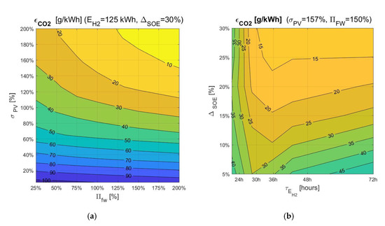 - the carbon dioxide emission factor ( —Equation (8)): it is a penalty factor, due to the residual GHG emissions of the system. It refers to the system as a whole, since it relates the total emissions to the total energy produced, by both RES and fossils generators.
