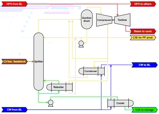 A typical arrangement of a heat pump-assisted distillation is provided in Figure 1. Here, a propane–propylene mixture is split into separate components of high purity (>99.6% vol.). The energy necessary for the separation is provided by a condensing steam turbine.