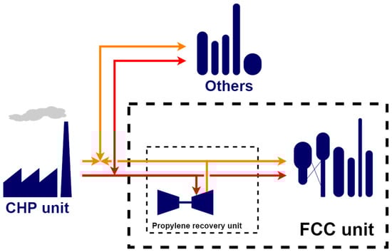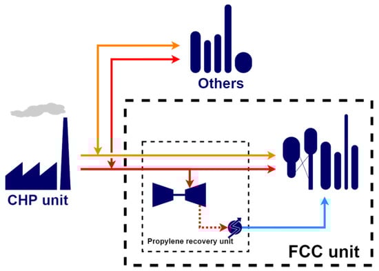 The process described in the previous text draws high-pressure steam from a steam network using a CHP unit as the main steam producer. As illustrated below (Figure 2), steam crossing the fluid catalytic cracking (FCC) unit battery limit is first supplied to the modeled system (propylene recovery unit) and then to other parts of the FCC unit. To account for all above-mentioned aspects, pipeline topology, geometry, and heat transfer properties were incorporated in the Aspen Plus® process model.