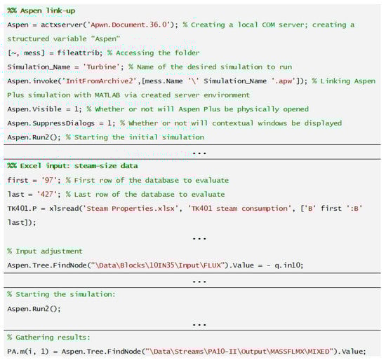 Figure 3. Example of Aspen Plus®–MATLAB® link utilization (for details see Appendix A). - From this point on, the Aspen–MATLAB® link is ready to use. To access results, manage inputs, and control the simulation and/or the user interface, dot notations are used. Examples of the syntax for various commands are given below: