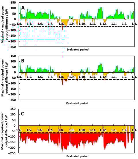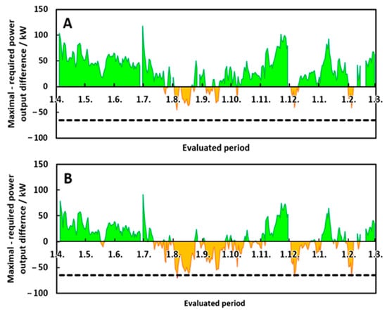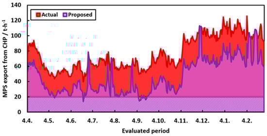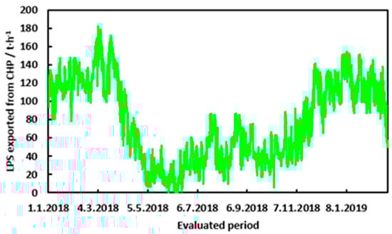 Another steam pressure level, LPS, can be considered as an alternative backpressure steam sink to the MPS, but it is less suitable for this purpose. The reason is an occasional LPS excess in summer and the resulting decrease of LPS export from the CHP to very low values, which negatively affects the steam quality in the main LPS pipelines. Additional LPS from a new backpressure steam drive would thus have to be vented into the atmosphere. This situation is well-documented in Figure 4, where occasional drops of LPS export from the CHP can be seen. Sudden one-direction changes in LPS export within a few days or one to two weeks (decrease in April, increase in November) result from switching on/off the space heaters and steam tracing in the refinery. The existing LPS excess in the refinery during summer months is a serious issue that has two consequences: First, lower economic attractiveness of incentives for LPS consumption decrease in the refinery. Second, low LPS export from the CHP leads to reduced backpressure power production. Long-term energy policy of the refinery includes the demand to secure the power supply to critical production units during outer grid outages (severe weather, unexpected events) from the CHP. Thus, a certain minimal power production in the CHP is required regardless of the actual season. As the backpressure power production is insufficient to cover this demand, additional power is produced in condensing steam turbines during warmer months. The average duration of this period is 40% of the year. Any changes in CHP backpressure power production resulting from the proposed change in the steam drive are reflected in the change of condensing power production in the opposite way during this period of the year.