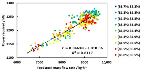 Steam turbines, like compressors, can be modeled on many levels—from basic enthalpy balance with constant isentropic efficiency to more complex approaches comprising turbine characteristics and correction curves [,]. Aspen Plus® did not provide the option to model turbines with the same precision as the compressors. Therefore, the characteristics and correction curves had to be input “manually”, via a calculator block. As only isentropic calculations were predefined for turbines, the model first calculated the turbine steam consumption based on the characteristics (required power output) and correction curves (live steam pressure, live steam temperature, exhaust pressure, and compressor revolutions). Then, the model iteratively calculated the isentropic efficiency of the turbine so that, based on the before-calculated steam consumption and enthalpy balance, the provided power output correlated with the required value.