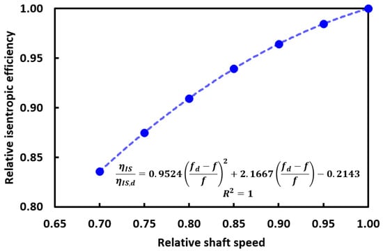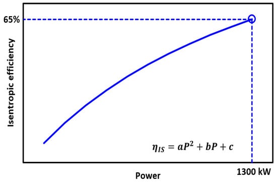 In general, there is a variety of approaches regarding compressor modeling—from the simplest calculations (e.g., polytropic work calculation with constant parameters and efficiencies) to the most complex ones (comprising efficiency and power maps, and shaft speed calculations) [,]. As shown later, the calculation should be carried out in the most precise way possible whenever the data is accessible as, for instance, compressor shaft revolutions affect the turbine efficiency drastically. Hence, performance and efficiency curves were included in the model via the Aspen Plus® interface. As a result, the model considered the mass flow through the compressor and the desired output pressure, and provided information on the required power input, polytropic efficiency, and shaft speed, as well as complete outlet stream results.