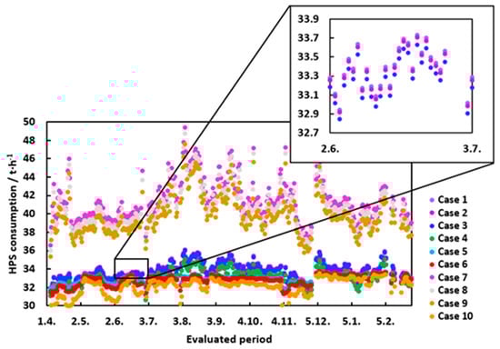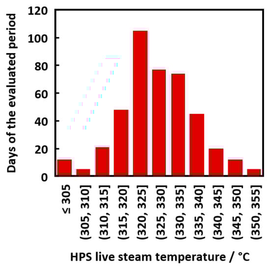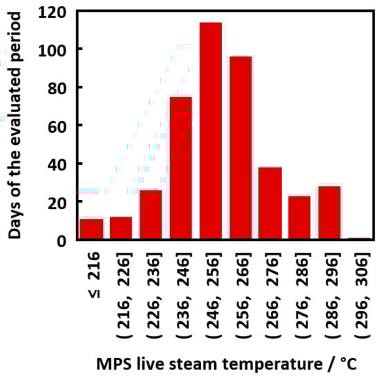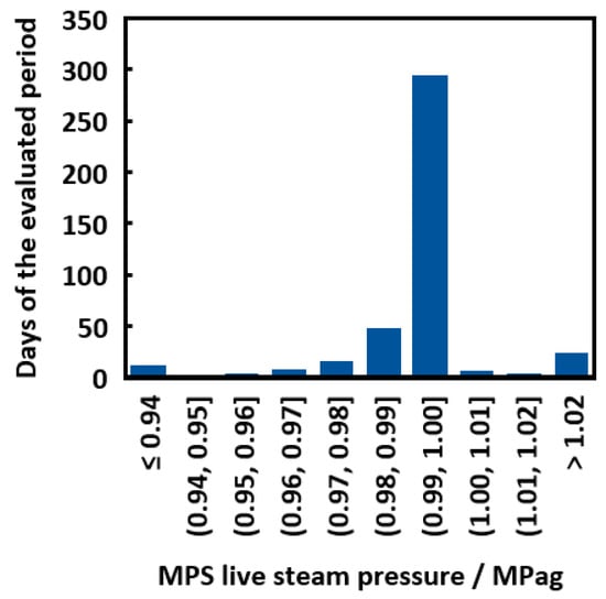 While most industrial facilities have a major steam source (e.g., a combined heat and power unit (CHP)), the utilization of waste heat from production units in means of steam production is also a common practice []. Moreover, the overall steam supply of these local producers can even exceed the major steam source production. Thus, the quality of the supplied steam varies significantly depending not only on the CHP unit’s operation but on the whole production network [,]. It is therefore vital for process drive sizing to account for steam quality fluctuations.