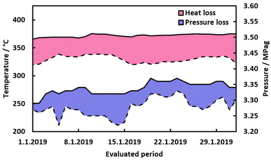 Effects of both pressure and heat losses vary greatly depending on pipeline geometry and mostly on the steam network topology and plant infrastructure, i.e., the resulting pipeline length. While the distance (pipe length) of the considered steam drive from the battery limit header can range in terms of tens of meters in some cases, there are units where the pipe length can reach hundreds of meters or even a kilometer. This is mostly the case of mid-twenty century refineries where individual units and their subunits were built far apart for safety reasons [].