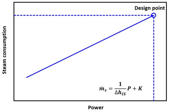 Process steam drives are important steam consumers in heavy industry [,,] and play a significant role in the design and operation of complex steam networks. The most common driven equipment includes compressors, pumps, and fans (blowers) [,,]. The steam turbines used can be of simple condensing, backpressure, or of a combined extraction condensing type []. Steam consumption is influenced by several factors that include the actual steam inlet parameters, steam discharge pressure, actual turbine revolutions, as well as the shaft work needed, which varies according to the process requirements. Process compressors driven by steam turbines are standard equipment of ethylene production and gas processing and fractionation plants [,], and they are also frequently used in compression heat pump-assisted distillations [,,,]. Thus, they are deeply integrated in the process. The shaft work needed depends on several process parameters, including (but not limited to) the distillation feed amount and composition, desired product quality, and column and compressor design parameters. This highlights the pressing need to develop a robust method for process steam drive sizing which would incorporate not only the real steam-side condition variations but also the process-side shaft work variations. Improper sizing results either in limited shaft work delivery (undersizing), causing possible process throughput limitations, or inefficient steam use (oversizing). Moreover, the steam drive design and operation have to be optimized with respect to the whole steam system, always taking into account the marginal steam source, its seasonal operation variations [], and the possible steam pipeline capacity constraints [,].