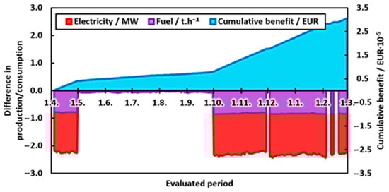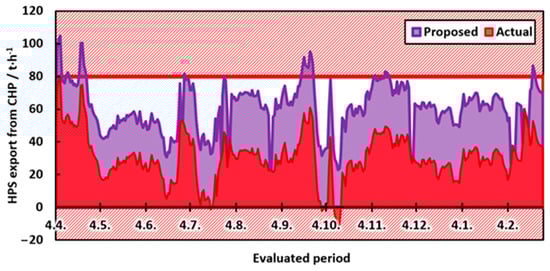 The considered CHP comprised high-pressure steam boilers (9 MPa, 530 °C) and a set of backpressure and extraction condensing turbines exporting high-pressure (HPS, 3.5 MPa), medium-pressure (MPS, 1.1 MPa), and low-pressure (LPS, 0.5 MPa) steam to the industrial facility. Constant marginal heat production efficiency of the CHP and constant marginal backpressure and condensing power production per one ton of steam were assumed. The effect of a change in the production unit steam balance on a certain pressure level was transposed to the corresponding change in backpressure electric energy production and fuel consumption in the CHP. A detailed description of the CHP unit operation and its further characteristics can be found elsewhere [,].