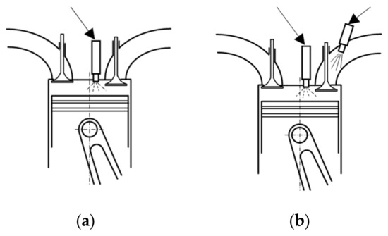 For many years, there has been an increased interest in the use of unconventional fuels for compressing piston engines [4,5]. In practice, there are two main ways of co-combustion of alternative fuel and diesel or biodiesel fuel. One way is to produce a blend of diesel fuel with other fuel and then bring the mixture to the engine, using a typical supply system for a diesel engine (Figure 1a). The greatest difficulties are phase separation and limiting miscible fuels. In the available literature, it can be find works on co-combustion of diesel fuel with gasoline. One of the important problems is to determine behavior of ignition during co-combustion of fuels of different reactivity. Nam et al. [6] investigated influences on auto ignition and combustion behaviors of various ambient temperatures from 600 to 800 K and different biodiesel fractions in blend with gasoline in a rapid compression expansion machine. They stated that with the increased biodiesel fraction in fuel blends, the ignition delay is shortened. It was stated that the reason for this is a better flammability of diesel fuel than gasoline. Another conclusion was that higher ambient temperature during injection decreases auto ignition delay of the gasoline/biodiesel blend. Putrasari et al. [7,8] conducted research on a gasoline compression ignition engine using a biodiesel additive to gasoline, compared to neat diesel fuel with single injection strategy. Authors stated that the higher biodiesel content in the fuel caused the higher cylinder pressure. The lower biodiesel fraction (5%) in the gasoline fuel resulted the lower thermal efficiency of engine. The next conclusion was that low-temperature (1800 K) combustion achieved for blend of 5% of diesel fuel with multiple injections. The heat release rates for multiple injections for burning of blend with 5% of diesel were lower than that for a single injection of 100% diesel [8]. The auto-ignition process and the ignition delay time were influenced by the quality of fuel fragmentation in the injection process. The researchers carried out experiments on the participation of gasoline fraction in a mixture with diesel fuel on the fuel jets. Das et al. [9] presented results of study on spray characteristics of neat gasoline and biodiesel addition (10%, 20% and 40% by volume) to gasoline in three different ratios under low load and different injection pressure conditions. They stated that an increase in injection pressure significantly accelerated the spray development process while penetration length increased with the increment of biodiesel fraction. The spray cone angle was increased for higher gasoline content which promotes a larger spray width. It is the higher density of biodiesel in comparison to gasoline that causes a smaller cone angle and higher penetration of the jet. A decrease in droplet size was observed according to breakup regimes under high injection pressure and low ambient density [9].