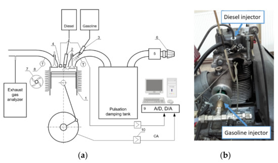 Diagram of the experimental setup. 1—engine, 2—diesel fuel injector, 3—gasoline fuel injector, 4—in cylinder pressure sensor, 5—intake air flowmeter, 6—air filter, 7—cooling fan, 8—exhaust gases temperature sensor, 9—PC with data acquisition system, 10—crank angle sensor. (a) experimental setup, (b) the test engine.