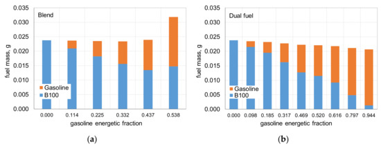 The lower heating value (LHV) of gasoline compared to the LHV of biodiesel is higher by 15%. Analyzing the data in Figure 4, it can be stated that with an increase in gasoline fraction in the case of dual fuel (DF), the fuel mass dose was decreased due to higher LHV of gasoline. In the case of blend combustion, the highest dose of fuel mass was noticed for higher gasoline energetic fraction due to deterioration of the combustion process. These data were determined based on hourly consumption of fuel with the assumption of a constant engine torque. With the largest fraction of gasoline, it was quite difficult to maintain a constant torque of the engines.