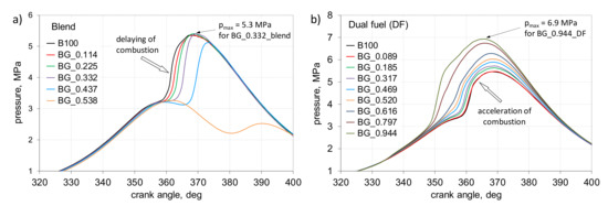 Pressure courses for blends (a) and dual fuel (b) combustion mode.